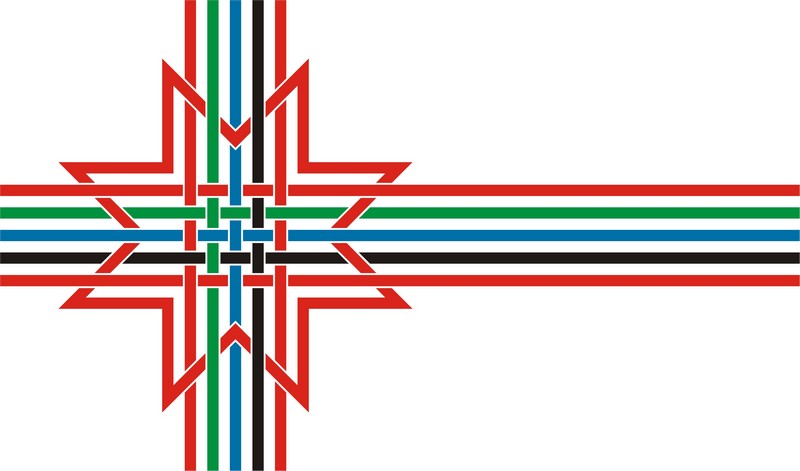 Look closer and the design reads like a miniature atlas. The cross layout nods to the Nordic visual language familiar on Finland’s flag. The palette plaits together cues many viewers recognise immediately—Estonia’s blue-black-white and Hungary’s red-white-green. At the center sits a red eight-pointed rosette, the same solar sign that appears on the flag of Udmurtia, where it is described officially as a protective symbol of the sun and life. In the project’s own words, the flag is “quite colourful,” intended to symbolize the diversity of Finno-Ugric peoples, held together on a white ground.