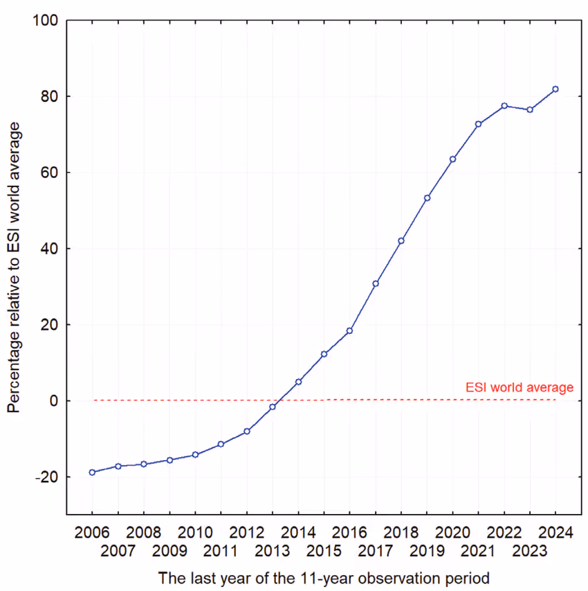 The result of these changes is starkly visible in the data. Over the 11-year period analyzed (2014–2024), Estonian researchers published 25,820 papers that were indexed in Clarivate’s Essential Science Indicators database. Those papers accumulated 792,400 citations, averaging about 30.7 citations per paper. The global average, for context, was 16.9 citations per paper over the same period. This means Estonia’s average impact was 181.7% of the world baseline (or 81.7% above it). Only two countries – Iceland and Singapore – scored higher on this metric. For a small nation with limited R&D spending, this statistic alone is astonishing.