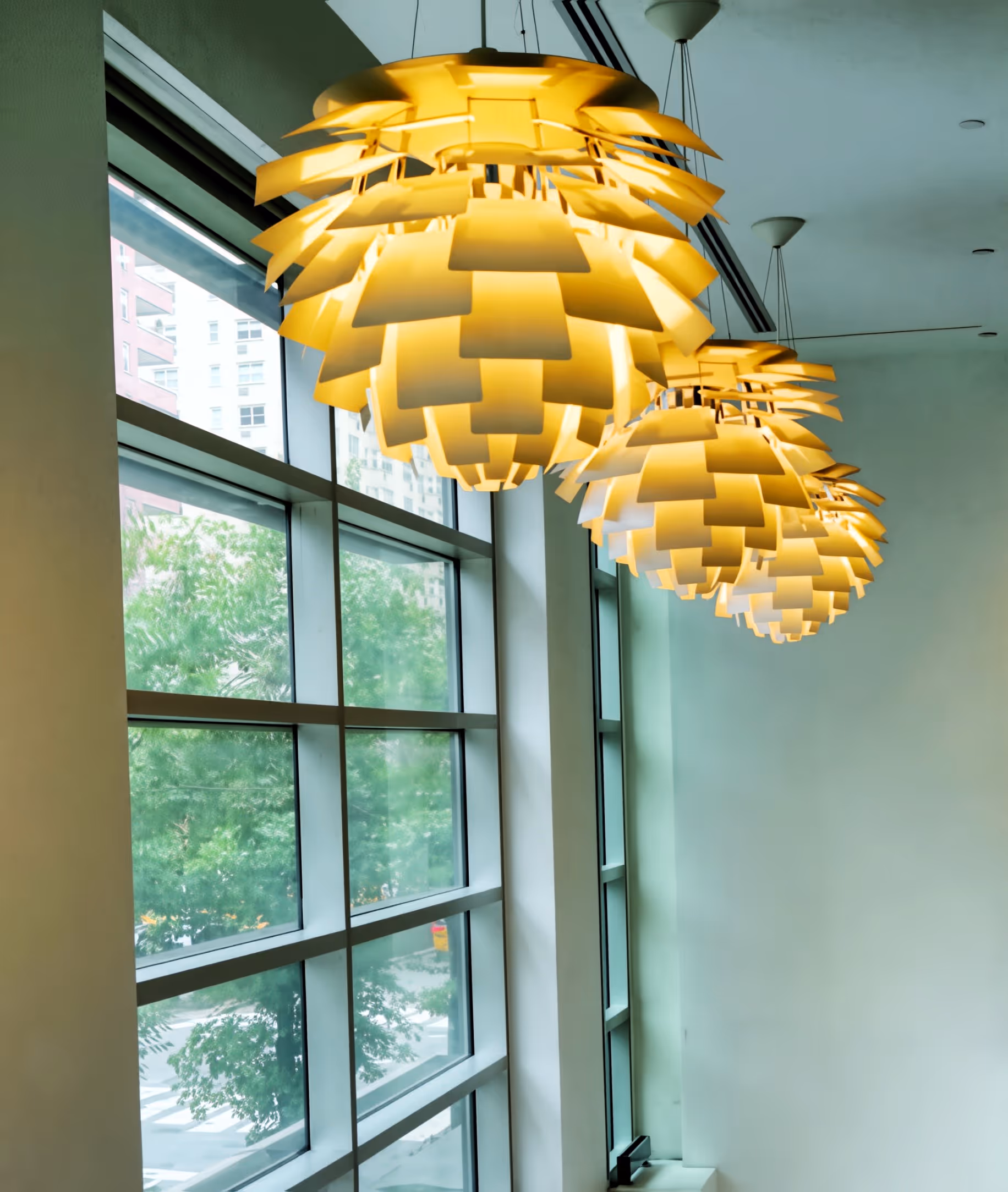 The architecture of the new Nordic center blended modern New York sleekness with Scandinavian sensibilities. Polshek’s team embraced minimalist forms and natural materials to reflect Nordic design ethos. The building’s understated elegance is evident in its facade of glass and zinc, with spare glass edges softened by golden-hued wood slats at the entrance and birch accents throughout the interior. Iconic Artichoke pendant lamps designed by Denmark’s Poul Henningsen cast a warm glow, providing hygge-like ambience in the lobby. Inside, the layout was purpose-built for cultural exchange: a ground-floor Nordic café and design shop to welcome visitors, a 168-seat auditorium below for films and concerts, a spacious gallery upstairs for art exhibitions, a library for Nordic literature, and even a dedicated children’s play and learning center. Every element was designed to say Velkommen/Välkommen – welcome – to the public. As ASF President Edward Gallagher (who oversaw the project from 1996 on) noted, they wanted a “fully public building” that would invite all New Yorkers to experience Nordic culture.