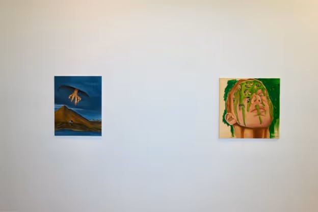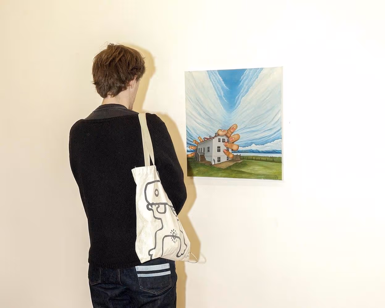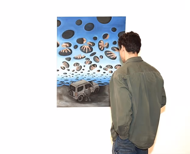In many of the exhibition’s pieces, vast, imposing landscapes inspired by the untouched mountains of Thelma’s homeland collide with surrealist elements on the canvas. In Within Grasps, a lone house in the middle of the wilderness is grasped by enlarged human hands reaching out from the beyond. There is something beautifully unsettling about this disembodied hand of the universe encroaching on the order of our day-to-day lives. Like all the work in Thelma’s debut exhibition, it explores the tensions between our tangible world and an ineffable, imagined realm. In the collection’s other pieces, Thelma seems to question mundanity itself through her depictions of everyday modern objects. A jeep car, a rural cottage, a New York apartment building all dialogue with the fantastical as spectral hands interrupt the canvas.